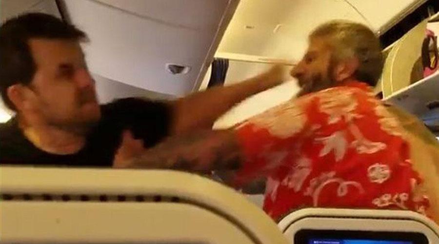 Ένας από τους επιβάτες βγάζει το κινητό του και απαθανατίζει τη στιγμή που δύο άντρες αρχίζουν να εξαπολύουν γροθιές ο ένας στον άλλο για άγνωστη αιτία.