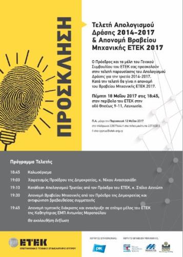 Κατά την τελετή, την οποία θα τιμήσει με την παρουσία του ο Πρόεδρος της Κυπριακής Δημοκρατίας, Νίκος Αναστασιάδης, θα πραγματοποιηθεί και η Απονομή του Βραβείου Μηχανικής 2017. Η εκδήλωση θα γίνει στον περίβολο του ΕΤΕΚ στην εντός των τειχών Λευκωσία (οδός Κερβέρου 8).