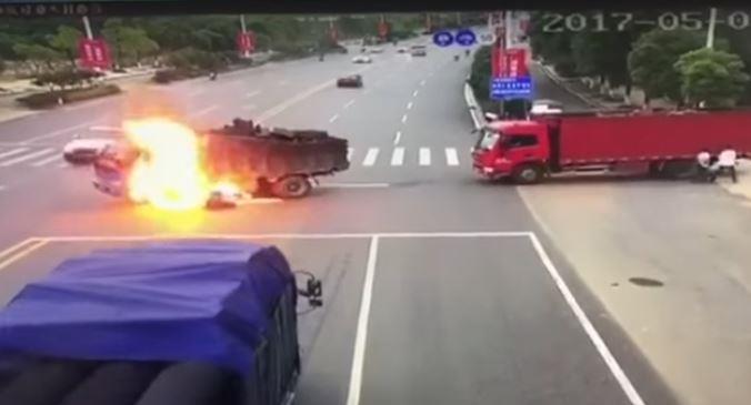 Σοκαριστική είναι η καταγραφή σε βίντεο της σύγκρουσης μοτοσικλέτας με φορτηγό. Η κάμερα έχει "συλλάβει" την ανατίναξη της μηχανής αλλά και τον αναβάτη που φλέγεται. Το περιστατικό συνέβη στο Ναντσάνγκ της Κίνας.