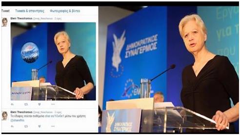 Σε καταγγελία για κλείσιμο του λογαριασμού στο Twitter, @EleniTheocharous_mep, που δημοσίευσε την φωτογραφία που την δείχνει να έχει περάσει από Photoshop φωτογραφία της από το βήμα του ΔΗΣΥ και να έχει προσθέσει τα σήματα του κινήματος Αλληλεγγύη, προχώρησε η Ελένη Θεοχάρους.