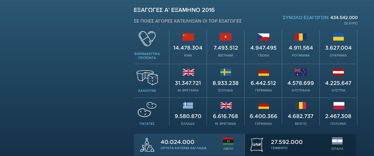 Στα €435 εκατ. ευρώ ανήλθε η συνολική αξία των εξαγωγών της Κύπρου για το πρώτο εξάμηνο του 2016, με τα φαρμακευτικά προϊόντα, χαλλούμι, πατάτες, τσιμέντο και διυλισμένα προϊόντα ορυκτών καυσίμων να συγκαταλέγονται στην πρώτη πεντάδα με τις μεγαλύτερες εξαγωγές σε αξία, κυπριακών προϊόντων.