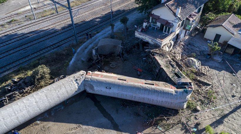 Οι εικόνες υπό το φως της ημέρας είναι συγκλονιστικές... Όπως βλέπετε, στα εναέρια πλάνα από το σημείο της τραγωδίας, το τραίνο βρίσκεται εξ' ολοκλήρου έξω από τις ράγες, ενώ τα πρώτα βαγόνια είναι σχεδόν διαλυμένα.