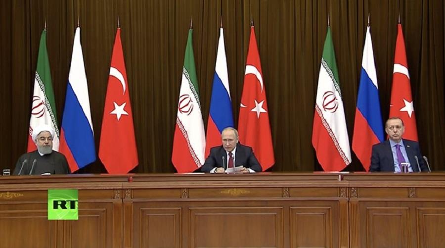 Οι πρόεδροι της Ρωσίας, του Ιράν και της Τουρκίας, Βλαντίμιρ Πούτιν, Ρετζέπ Ταγίπ Ερντογάν και Χασάν Ροχανί, στις συνομιλίες που είχαν σήμερα στο Σότσι στις οποίες παρευρίσκοντο οι υπουργοί Εξωτερικών και Άμυνας των τριών χωρών, επικεντρώθηκαν στην πολιτική διευθέτησης της κρίσης στην Συρία μετά το τέλος των εχθροπραξιών, στη σημασία του πολιτικού διαλόγου μεταξύ όλων των εμπλεκόμενων πλευρών περιλαμβανομένης και της συριακής κυβέρνησης, αλλά και στις προοπτικές ανοικοδόμησης της Συρίας μετά τις τεράστιες καταστροφές που έχει υποστεί η χώρα κατά την διάρκεια του εμφυλίου πολέμου.