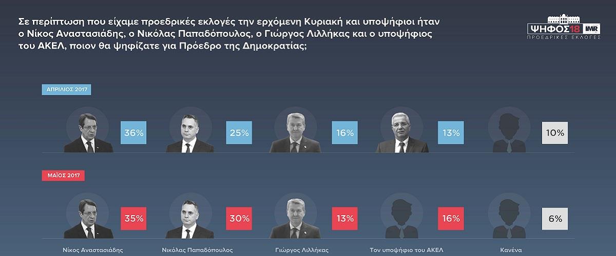 *Νίκος Αναστασιάδης και Νικόλας Παπαδόπουλος θα περνούσαν στον δεύτερο γύρο των προεδρικών εκλογών, στην περίπτωση κατά την οποία οι δύο ήταν οι υποψήφιοι μαζί με τον Γιώργο Λιλλήκα, με τον τελευταίο μάλιστα να υποστηρίζεται από το ΑΚΕΛ.