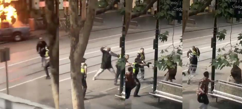 A man has been shot by #Police after making #stabbing gestures at two uniformed officers near a burning #Car in central #Melbourne. #Australia pic.twitter.com/PtfhxEaznC
