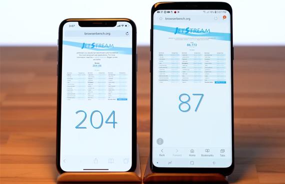 Περνώντας στο GFXBench OpenGL στο 1080P Manhattan Offscreen τεστ, το iPhone X απέδωσε ελάχιστα καλύτερα με 5.463 έναντι 5.106 πόντων του S9+ ενώ στο Jetstream browser benchmark το iPhone X ισοπεδώνει με 204 πόντους το S9+ και τους 87 που σκόραρε, με τη δοκιμή να γίνεται ανάμεσα στους stock browsers, το Safari και Samsung Internet Browser, ενώ δεν αποκλείεται το S9+ να απέδιδε καλύτερα εαν η δοκιμή γινόταν με κάποιον άλλο third party web browser.