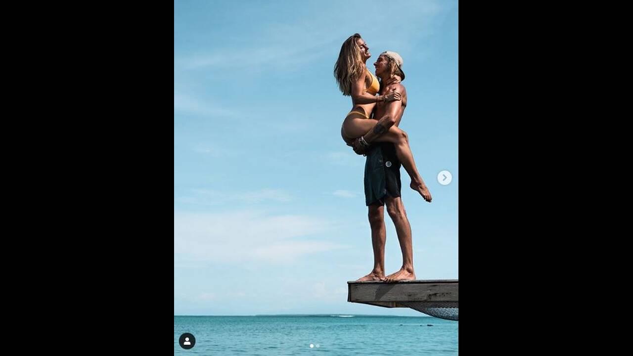 Στη φωτογραφία που ανέβασε το ζευγάρι στον λογαριασμό του στο Instagram, ο άντρας είναι καθισμένος πάνω σε ένα βράχο και κρατάει τη γυναίκα από τα χέρια.