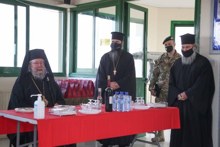 Στο φυλάκιο που επισκέφθηκε ο Αρχιεπίσκοπος, η οργανωμένη χορωδία των στρατιωτών έψαλε επίκαιρους ύμνους και κάλαντα καθώς και πατριωτικα άσματα, αναφέρεται.