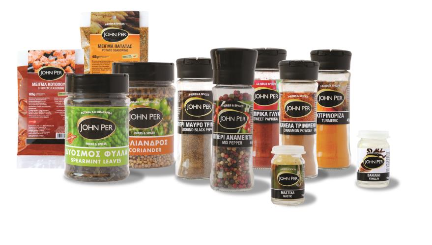 Για τα προϊόντα John Per χρησιμοποιούνται πρώτες ύλες μόνο άριστης ποιότητας που έχουν επιλεγεί προσεκτικά από εξωτερικούς αλλά και ντόπιους παραγωγούς. Η John Per προσφέρει μια ευρεία ποικιλία βοτάνων και μπαχαρικών όπως Ελληνική Ρίγανη, Κυπριακό Δυόσμο, Κιτρινόριζα από την Ινδία, Πάπρικα από την Ισπανία, Εστραγκόν από την Γαλλία, και άλλα πολλά που προσφέρουν νοστιμιά αλλά και ευεργετικές ιδιότητες στη ζωή μας. Τα προϊόντα προσφέρονται σε διάφορα είδη συσκευασιών όπως γυάλινα μπουκαλάκια, μύλοι και σακουλάκια που είναι κατασκευασμένα από ειδικά υλικά ώστε να μην φθείρονται, και να διατηρούν αναλλοίωτο το άρωμα, τη γεύση και τα ενεργά συστατικά των προϊόντων. Πάντοτε με άριστες προδιαγραφές υγιεινής και χωρίς συντηρητικά. Εχτός από 100% φυσικά βότανα και μπαχαρικά, η John Per προσφέρει και έτοιμα μείγματα μπαχαρικών και βοτάνων όπως μείγμα για κοτόπουλο, ψάρι, σουβλάκι, σαλάτα, πατάτες και τζατζίκι.