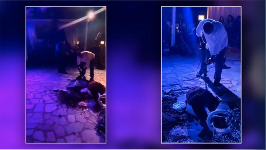 Την ώρα που ένας άντρας χορεύει ζεϊμπέκικο στην πίστα, κάποιος άλλος φαίνεται πως «δεν αρκείται στα πιάτα», που συνηθίζουν να σπάνε ως έθιμο στους γάμους, αλλά φροντίζει «για το καλό» να «ξηλώσει» ακόμα και τα πλακάκια του χώρου, χρησιμοποιώντας ένα... κομπρεσέρ!