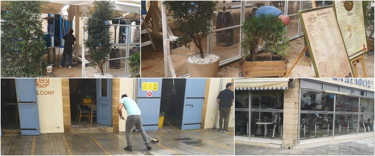 Στην παλιά Λευκωσία, όπου υπάρχουν αρκετοί χώροι εστίασης, άλλοι μπογιάτιζαν, άλλοι καθάριζαν καρέκλες και τραπέζια και άλλοι περιποιούνταν τα μέχρι πρότινος αφημένα, λόγω του lockdown, μαγαζιά τους.