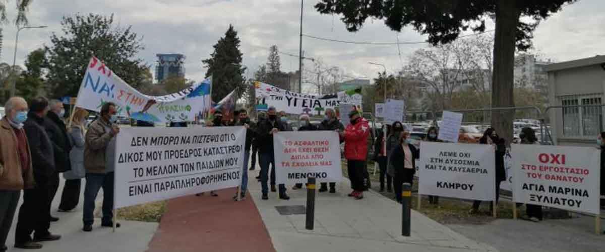 Κοινοτάρχες της περιοχής Μιτσερού, η Ομάδα Πρωτοβουλίας «Κοινότητες Εν Δράσει» και κάτοικοι των 12 επηρεαζόμενων κοινοτήτων - Αγίας Μαρίνας, Αγίου Επιφανείου, Αγίου Ιωάννη, Αγροκηπιάς, Αρεδιού, Καλού Χωριού, Κάτω Μονής, Κλήρου, Μαλούντας, Μένοικου, Μιτσερού και Ορούντας - συγκεντρώθηκαν το πρωί έξω από το Υπουργείο Εσωτερικών διαμαρτυρόμενοι για την απόφαση μεταφοράς εργοστασίου παρασκευής ασφάλτου, από το Δάλι στην περιοχή τους.