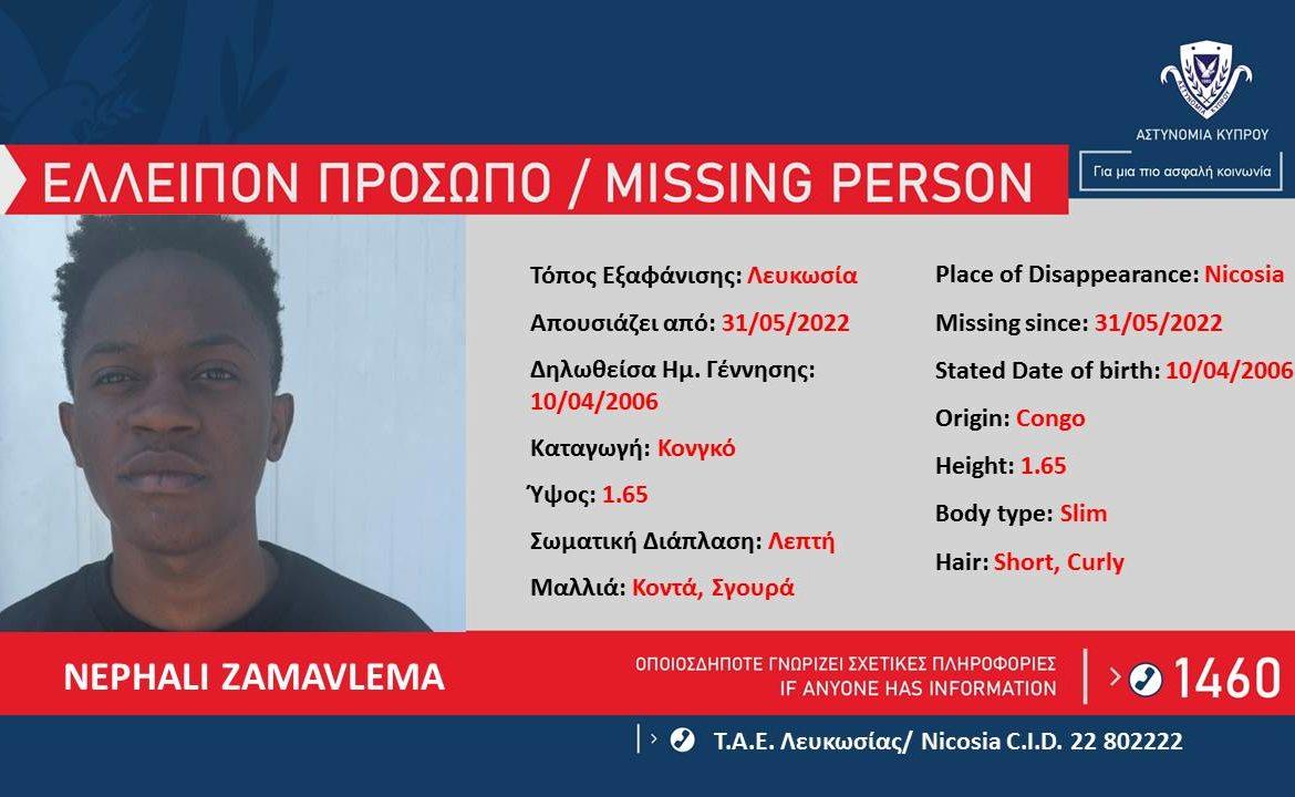 Πρόκειται για τον Nephali Zamavlema, ημερομηνία γέννησης 10/04/2006, από το Κονγκό, ο οποίος ελλείπει από την Τρίτη, 31 Μαΐου, 2022.