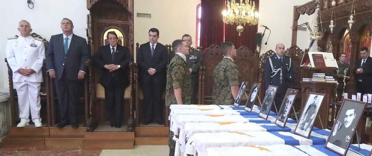 Στις 9 το πρωί στον ιερό ναό της Του Θεού Σοφίας, στη Λευκωσία, έγινε η επίσημη τελετή παράδοσης - παραλαβής των λειψάνων, παρουσία συγγενών των πεσόντων από την Ελλάδα. Παρέστη πρόεδρος  Αναστασιάδης και την κυβέρνηση της Ελλάδος εκπροσώπησε ο υπουργός Εθνικής 'Αμυνας Πάνος Καμμένος.