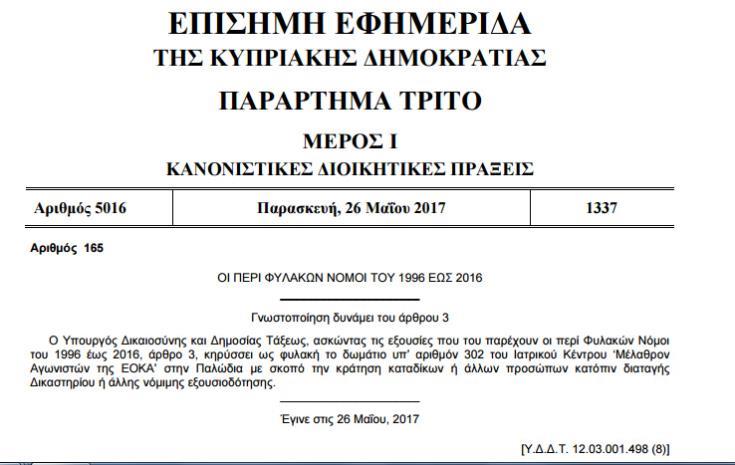 Ο Υπουργός Δικαιοσύνης και Δημοσίας Τάξεως Ιωνάς Νικολάου κήρυξε ως φυλακή το δωμάτιο υπ` αριθμόν 302 του Ιατρικού Κέντρου `Μέλαθρον Αγωνιστών της ΕΟΚΑ` στην Παλώδια.