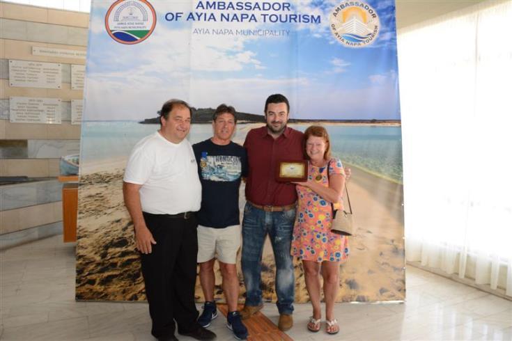Απονέμοντας στους Βρετανούς αναμνηστική πλακέτα και τον τίτλο του Πρέσβη του τουρισμού της Αγίας Νάπας, ο κ. Χρήστου ανέφερε πως οι 44 επισκέψεις τους στη περιοχή «αποδεικνύουν το μέγεθος της αγάπης» τους στην Αγία Νάπα και «αυτό αποτελεί τον καταλύτη για την ανάδειξή της σε ένα από τους πιο αξιόλογους τουριστικούς προορισμούς της Μεσογείου».