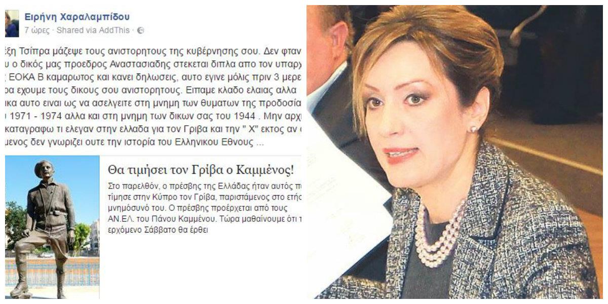 Η κα Χαραλαμπίδου σε ανάρτηση της στα μέσα κοινωνικής δικτύωσης, κάλεσε τον πρωθυπουργό Αλέξη Τσίπρα «να μαζέψει τους ανιστόρητους της κυβέρνησης του», αναφερόμενη στον Πάνο Καμμένο.