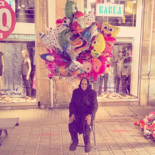 Από το πρωί μέχρι αργά το βράδυ, κάθεται σε μια καρέκλα στην Λήδρας πουλώντας μπαλόνια.
