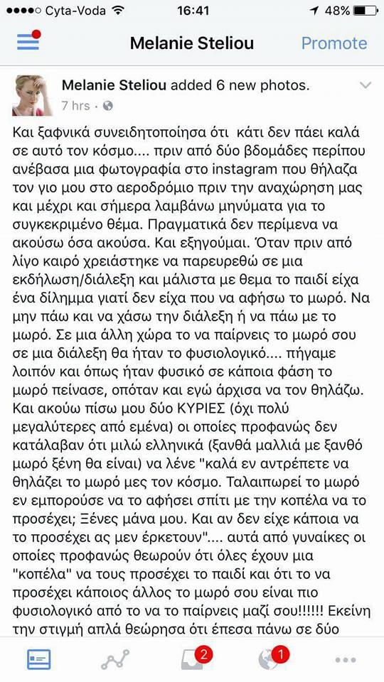 Η Μέλανη, που από τότε που έγινε μανούλα έχει ταχθεί υπέρ του δημόσιου θηλασμού, ανήρτησε το πρωί στην προσωπική της σελίδα στο facebook εκ νέου κάποιες φωτογραφίες να θηλάζει το αγοράκι της, περιγράφοντας ένα πρόσφατο συμβάν που έζησε η ίδια, μέσα από το οποίο ένιωσε τον ρατσισμό από άλλες γυναίκες επειδή επέλεξε να θηλάσει το μωρό της σε μια διάλεξη όταν αυτό πείνασε.