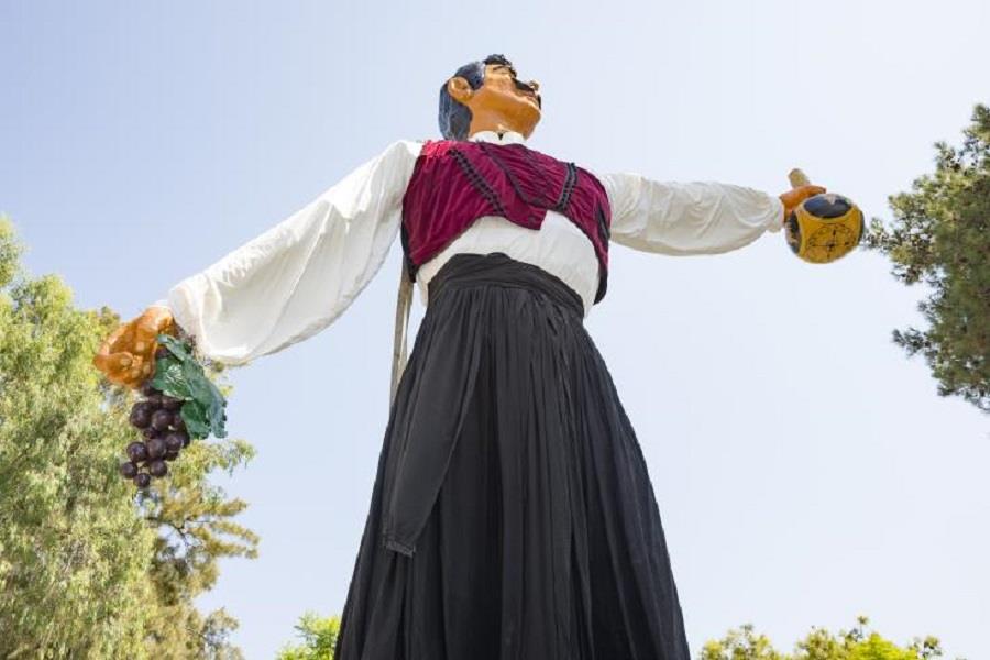 Η επιβλητική μορφή του περήφανου βρακοφόρου αμπελουργού, ύψους επτά μέτρων, που στο ένα του χέρι κρατά το τσαμπί και στο άλλο το παραδοσιακό "κολότζι" με το κρασί, υποδέχεται από χθες τους επισκέπτες του δημόσιου κήπου της Λεμεσού, ενόψει της 56ης Γιορτής του Κρασιού, που θα πραγματοποιηθεί από τις 31 Αυγούστου μέχρι τις 10 Σεπτεμβρίου.