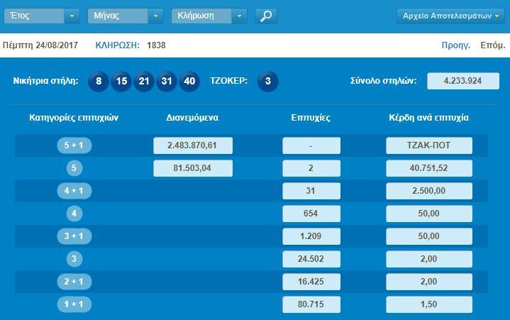 Οι τυχεροί αριθμοί που κληρώθηκαν είναι: 8, 15, 21, 31, 40. Τζόκερ: 3