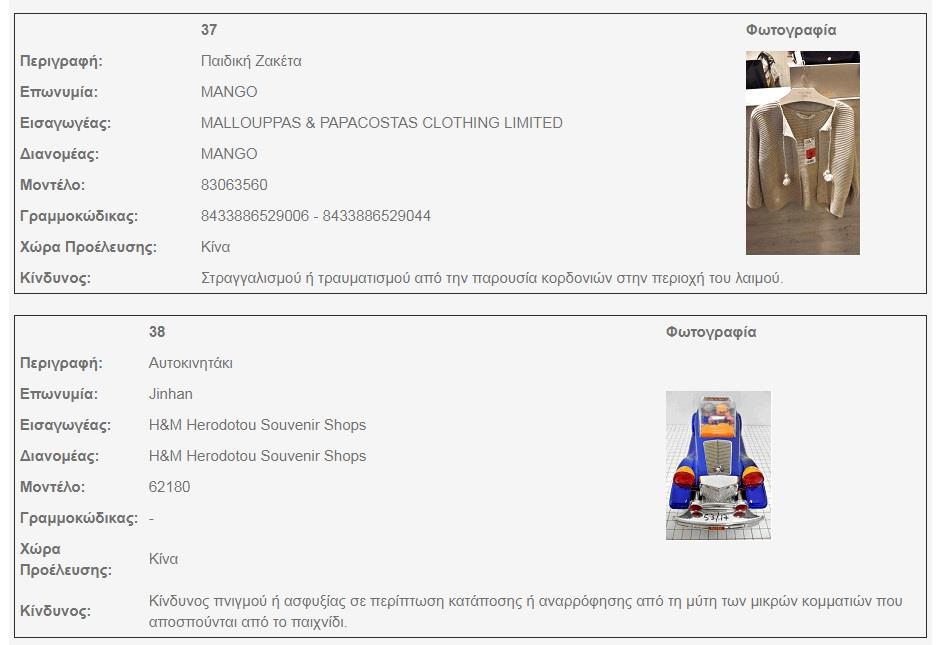 Σύμφωνα με ανακοίνωση της Υπηρεσίας Προστασίας Καταναλωτή, τα προϊόντα τα οποία έχουν κριθεί ότι εγκυμονούν σοβαρούς κινδύνους για την υγεία και την ασφάλεια των καταναλωτών ή δεν συμμορφώνονταν με τις σχετικές πρόνοιες της νομοθεσίας είναι τα ακόλουθα: