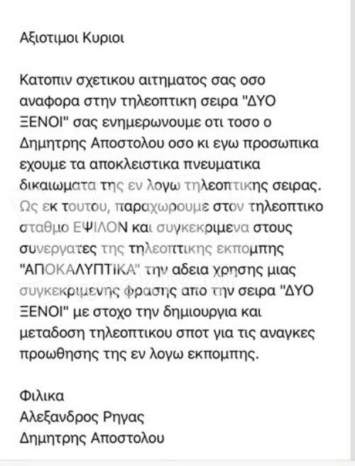 Στην συγκεκριμένη επιστολή που παρουσίασε σήμερα το Dimis Blog, ο Αλέξανδρος Ρήγας, ο οποίος είναι ο αποστολέας, αναφέρει πως μόνο εκείνος και ο Δημήτρης Αποστόλου έχουν τα πνευματικά δικαιώματα και πως δίνουν την άδεια στην εκπομπή «αποκαλυπτικά», ώστε να χρησιμοποιήσουν τα συγκεκριμένα αποσπάσματα για το τρέιλερ! Η επιστολή, όπως θα δείτε και μόνοι σας αναφέρει χαρακτηριστικά: