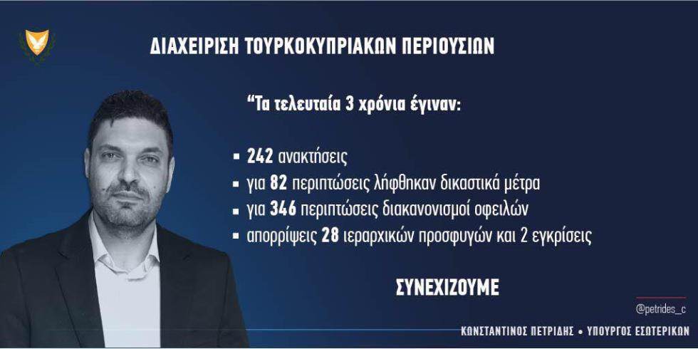 Παράλληλα, ο κ. Πετρίδης είπε πως η Κυβέρνηση υπό την υπουργία του προκάτοχού του, Σωκράτη Χάσικου «είναι η πρώτη κυβέρνηση η οποία τόλμησε να λάβει ουσιαστικά μέτρα για την αντιμετώπιση των κακώς εχόντων», καθώς προέβη σε συνολικά σε 242 ανακτήσεις, που αφορούν 49 περιπτώσεις στη Λευκωσία, 23 στη Λεμεσό, 30 στη Λάρνακα και 140 στην Πάφο.
