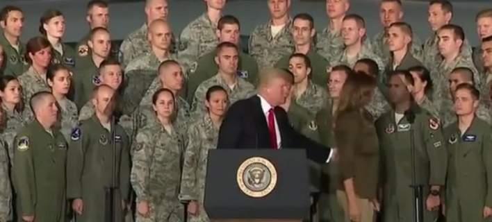 Ο Αμερικανός πρόεδρος ευχαρίστησε την Μελάνια Τραμπ με μία... χειραψία και στη συνέχεια της είπε πού να πάει, σπρώχνοντάς την στην πλάτη.