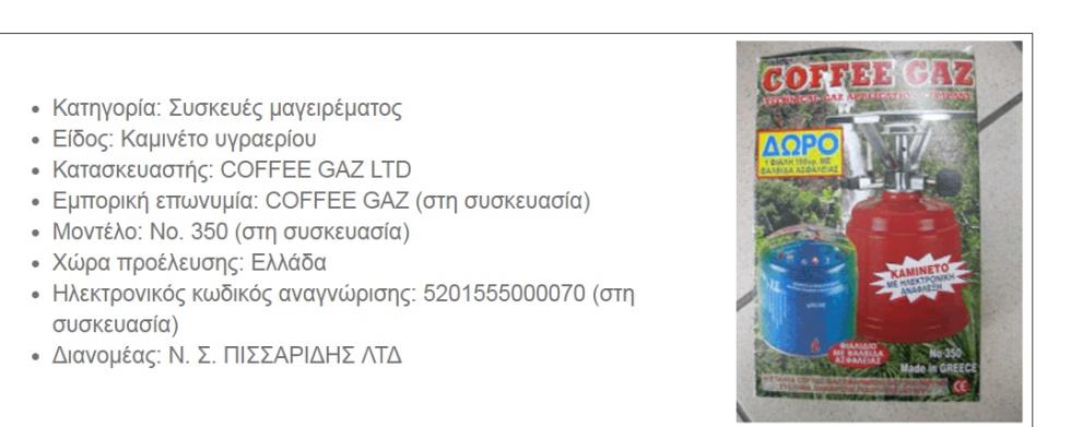 Καμινέτο υγραερίου, προερχόμενο από την Ελλάδα, αποσύρεται από την αγορά επειδή δεν φέρει την σήμανση Ρª  αναφέρει το Τμήμα Ηλεκτρομηχανολογικών Υπηρεσιών σε ανακοίνωση. Συγκεκριμένα πρόκειται για το πιο κάτω προϊόν .