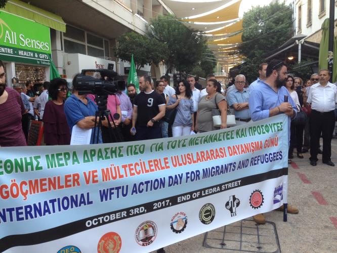 Η ΠΕΟ και τα τουρκοκυπριακά συνδικάτα DEV-IS, KTAMS, KTOS, KTOEOS, BES, KOOP-SEN, DOU-SEN, διοργάνωσαν το απόγευμα στο τέρμα της οδού Λήδρας, εκδήλωση στήριξης και αλληλεγγύης για τους πρόσφυγες και τους μετανάστες με αφορμή τις κινητοποιήσεις της 3ης Οκτωβρίου που οργανώνει η Παγκόσμια Συνδικαλιστική Ομοσπονδία (ΠΣΟ).