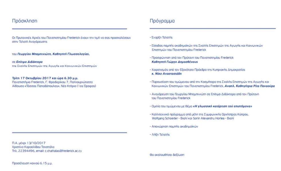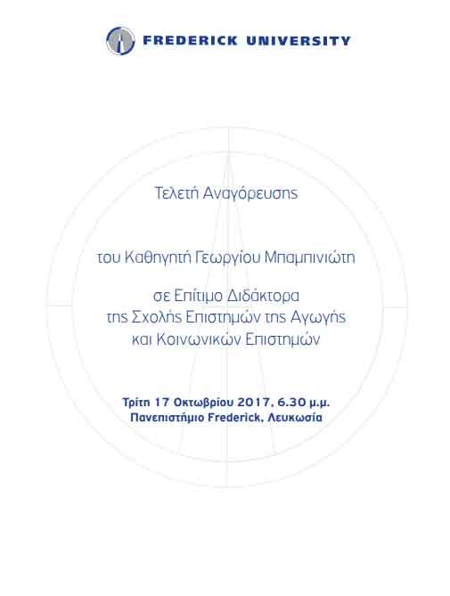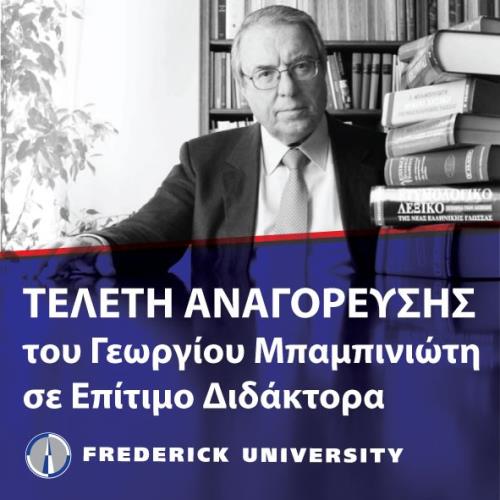 To Πανεπιστήμιο Frederick αναγορεύει τον Ομότιμο Καθηγητή Γεώργιο Μπαμπινιώτη σε Επίτιμο Διδάκτορα της Σχολής Επιστημών της Αγωγής και Κοινωνικών Επιστημών, την Τρίτη 17 Οκτωβρίου 2017, και ώρα 18:30, στην Αίθουσα «Τάσσος Παπαδόπουλος».