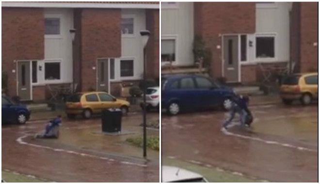 Το ξεκαρδιστικό βίντεο της αγωνιώδους προσπάθειας ενός άντρα να πετάξει μια σκουπιδοσακούλα περνώντας πάνω από το παγωμένο οδόστρωμα.