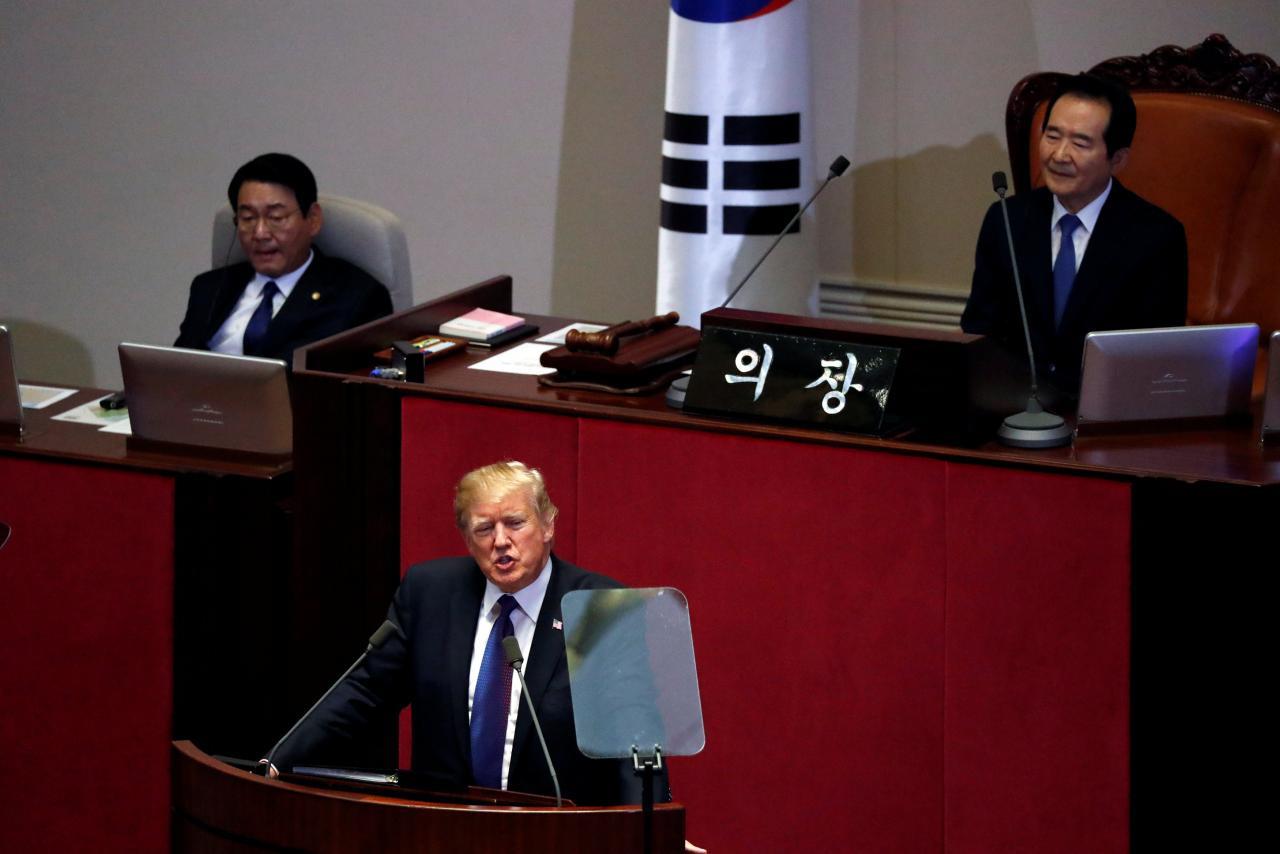 Στην ομιλία του ενώπιον του νοτιοκορεάτικου κοινοβουλίου με την οποία προγραμμάτιζε να ολοκληρώσει την 24ωρη επίσκεψή του στη Νότια Κορέα πριν ταξιδέψει στην Κίνα για να συνεχίσει τον ασιατικό του μαραθώνιο, ο Τραμπ είπε ότι «δεν θα επιτρέψουμε οι χειρότερες ωμότητες στην ιστορία να επαναληφθούν εδώ, σε αυτό το έδαφος που πολεμήσαμε και πεθάναμε για να εξασφαλίσουμε», υπενθυμίζοντας την εμπλοκή των ΗΠΑ στον πόλεμο της Κορέας.