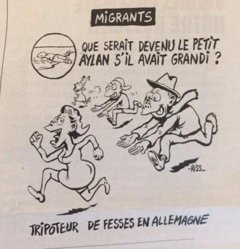 Στο σκίτσο, που υπογράφεται από τον Riss (Λοράν Σουρισό), τον διευθυντή έκδοσης της εφημερίδας, ένας έκφυλος κυνηγάει μια γυναίκα. "Τι θα είχε γίνει ο μικρός Αϊλάν αν είχε μεγαλώσει;" τιτλοφορείται η γελοιογραφία, ερώτημα που απαντάται από κάτω: "Εφαψίας στη Γερμανία".