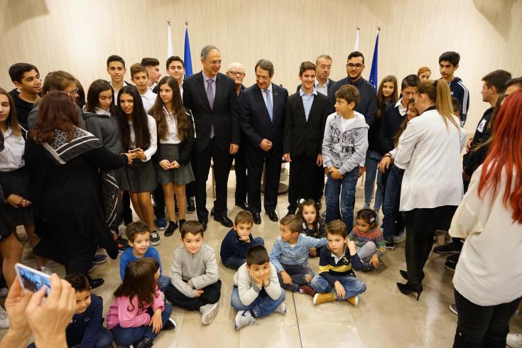 Εκπροσώπους της Παιδοβουλής, από τη νηπιακή ηλικία έως και το Λύκειο, δέχτηκε σήμερα στο Προεδρικό Μέγαρο ο Πρόεδρος της Δημοκρατίας Νίκος Αναστασιάδης, με την ευκαιρία της επετείου υπογραφής της Διεθνούς Σύμβασης για τα Δικαιώματα του Παιδιού.