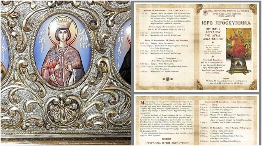 Το ιερό λείψανο της Αγίας Αικατερίνης για προσκύνημα θα βρίσκεται στην εκκλησία Αγίου Γεωργίου στην Πάνω Δευτερά από τις 20 Δεκεμβρίου μέχρι τις 27 Δεκεμβρίου.