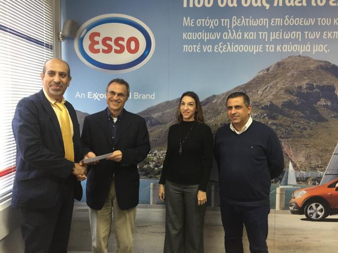 Ο κος. Κυριάκος Κούππας, Διευθυντής Πωλήσεων της ExxonMobil/Εsso Κύπρου (κέντρο) παραδίδει την εισφορά στον Πρόεδρο της Ομοσπονδίας κον. Ευθύμιο Πολυδώρου. Παρόντες επίσης η κα. Λουΐζα Παπαγεωργίου, Public & Government Affairs Advisor της εταιρείας και ο κος. Αντώνης Κωνσταντινίδης, Senior Territory Manager της ExxonMobil/Esso Κύπρου.