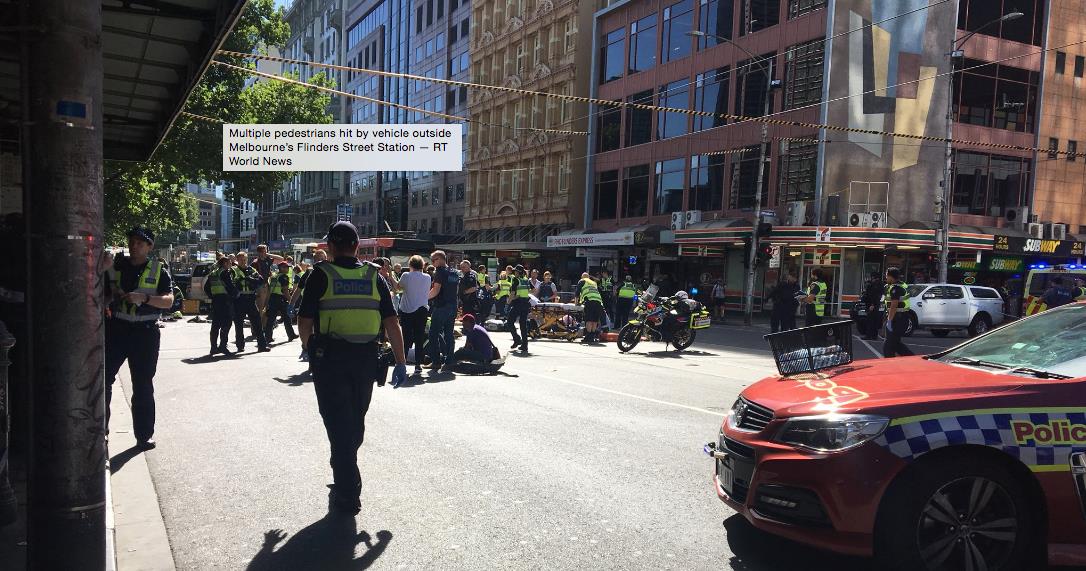 Το περιστατικό συνέβη στην οδό Flinders μεταξύ των οδών Elizabeth και Swanston. Σύμφωνα με τοπικά πηγές, περίπου 12 εκτιμάται πως είναι οι τραυματίες, δύο εκ των οποίων -ανάμεσά τους και ένα παιδί- σοβαρά.