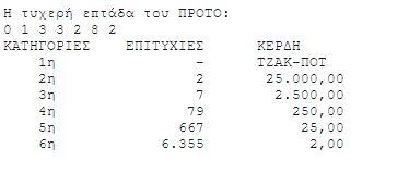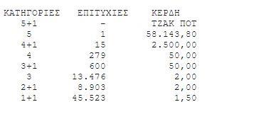 Στην σημερινή κλήρωση βρέθηκε μόνο ένα τυχερό δελτίο  στη δεύτερη κατηγορία που κερδίζει 58.143 ευρώ.