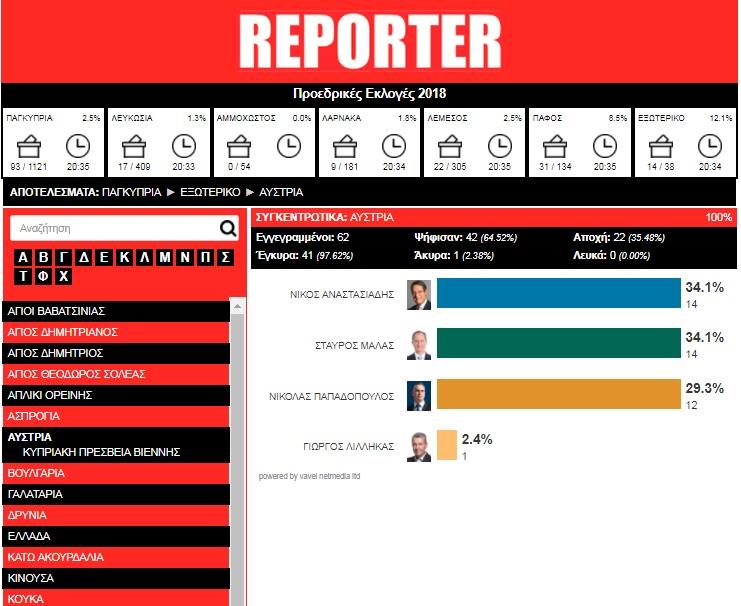 Μοιρασμένοι στα 3 οι Κύπριο ψηφοφόροι της Αυστρίας με Νίκο Αναστασιάδη και Σταύρο Μαλά να λαμβάνουν και οι δυο το ποσοστό 34,1%.