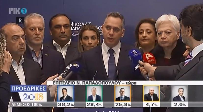 «Είμαι απογοητευμένος από το αποτέλεσμα, αλλά σέβομαι την ετυμηγορία του λαού μας. Ο ενδιάμεσος χώρος μπορεί να αποτελέσει τον τρίτο πόλο» δήλωσε ο Νικόλας Παπαδόπουλος περιστοιχισμένος από τους αρχηγούς κομμάτων που τον υποστήριξαν μετά την ανακοίνωση των τελικών αποτελεσμάτων.