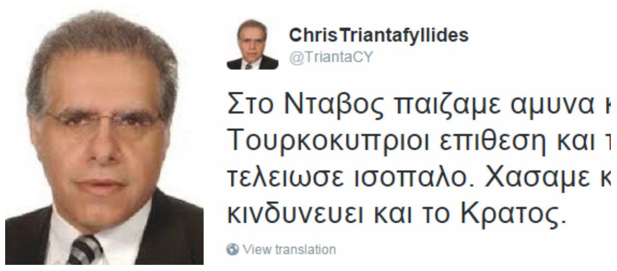 Μάλιστα σε ανάρτηση του στο διαδίκτυο ο κ. Τρανταφυλλίδης προχωρά και ένα βήμα πάρα πέρα λέγοντας πως στο Νταβός «παίζαμε άμυνα και οι Τουρκοκύπριοι επίθεση και το παιγνίδι δεν τέλειωσε ισόπαλο. Χάσαμε κατά κράτος και κινδυνεύει και το Κράτος.