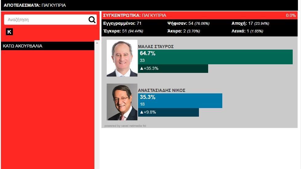 Tο πρώτο παγκύπριο αποτέλεσμα των προεδρικών εκλογών