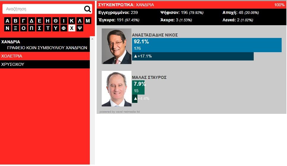 Στο χωριό Χανδριά, ο Νίκος Αναστασιάδης σάρωσε καθώς το 92,1% τον ψήφισε ενώ ο Σταύρος Μαλάς  έλαβε το ποσοστό 7,9%.
