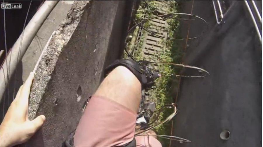 Αυτό σίγουρα πόνεσε. Ένας αλεξιπτωτιστής προσπάθησε να προσγειωθεί δίπλα σε σταθμό τρένου όμως φάνηκε άτυχος αφού ο άνεμος τον έφερε προς την πλευρά ενός τοίχου ο οποίος ήταν καλυμμένος με σκουριασμένο συρματόπλεγμα.