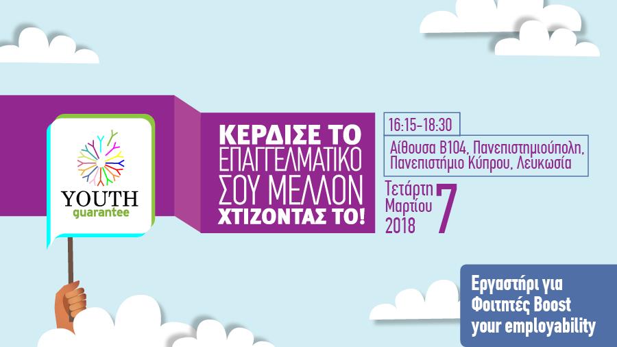 Είσαι φοιτητής κι ενδιαφέρεσαι για τα προγράμματα εργοδότησης, κατάρτισης κι εκπαίδευσης που τρέχουν στην Κύπρο; Άδραξε την ευκαιρία κι ενημερώσου για το πρόγραμμα “Youth Guarantee”. Λάβε γνώση κι εμπειρία από Εκπαιδευτές Μη Τυπικής Μάθησης της ομάδας εκπαιδευτών του Συμβουλίου Νεολαίας, στο αντίστοιχο Εργαστήρι για φοιτητές με τίτλο Boost your εemployability. Το Εργαστήρι θα πραγματοποιηθεί την Τετάρτη 7 Μαρτίου 2018, στην Αίθουσα Β104 στην Πανεπιστημιούπολη, Πανεπιστήμιο Κύπρου, Λευκωσία.