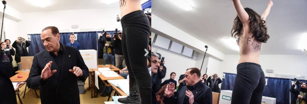 Ενώ ο πρώην Καβαλιέρε βρισκόταν μέσα στο τμήμα, μια μελαχρινή κοπέλα του κινήματος Femen έβγαλε την μπλούζα της και έμεινε με γυμνό στήθος.