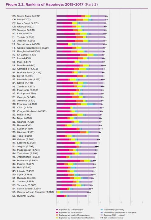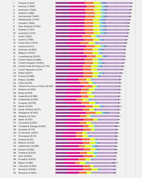Η έκθεση του ΟΗΕ για την Παγκόσμια Ευτυχία του 2018 κατέταξε 156 χώρες, σύμφωνα με τις επιδόσεις τους σε δείκτες όπως το κατά κεφαλήν Ακαθάριστο Εγχώριο Προϊόν, η κοινωνική στήριξη, ελευθερία, το προσδόκιμο υγιούς ζωής, η γενναιοδωρία, η απουσία διαφθοράς.