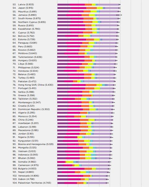 Η Ελλάδα κατατάσσεται στην 79η θέση κάτω από την Σερβία και πάνω από το Τατζικιστάν. Το Μπουρούντι είναι τελευταίο στον κατάλογο του δείκτη ευτυχίας και οι Αμερικανοί είναι λιγότερο ευτυχισμένοι παρότι η χώρα τους έγινε πλουσιότερη.